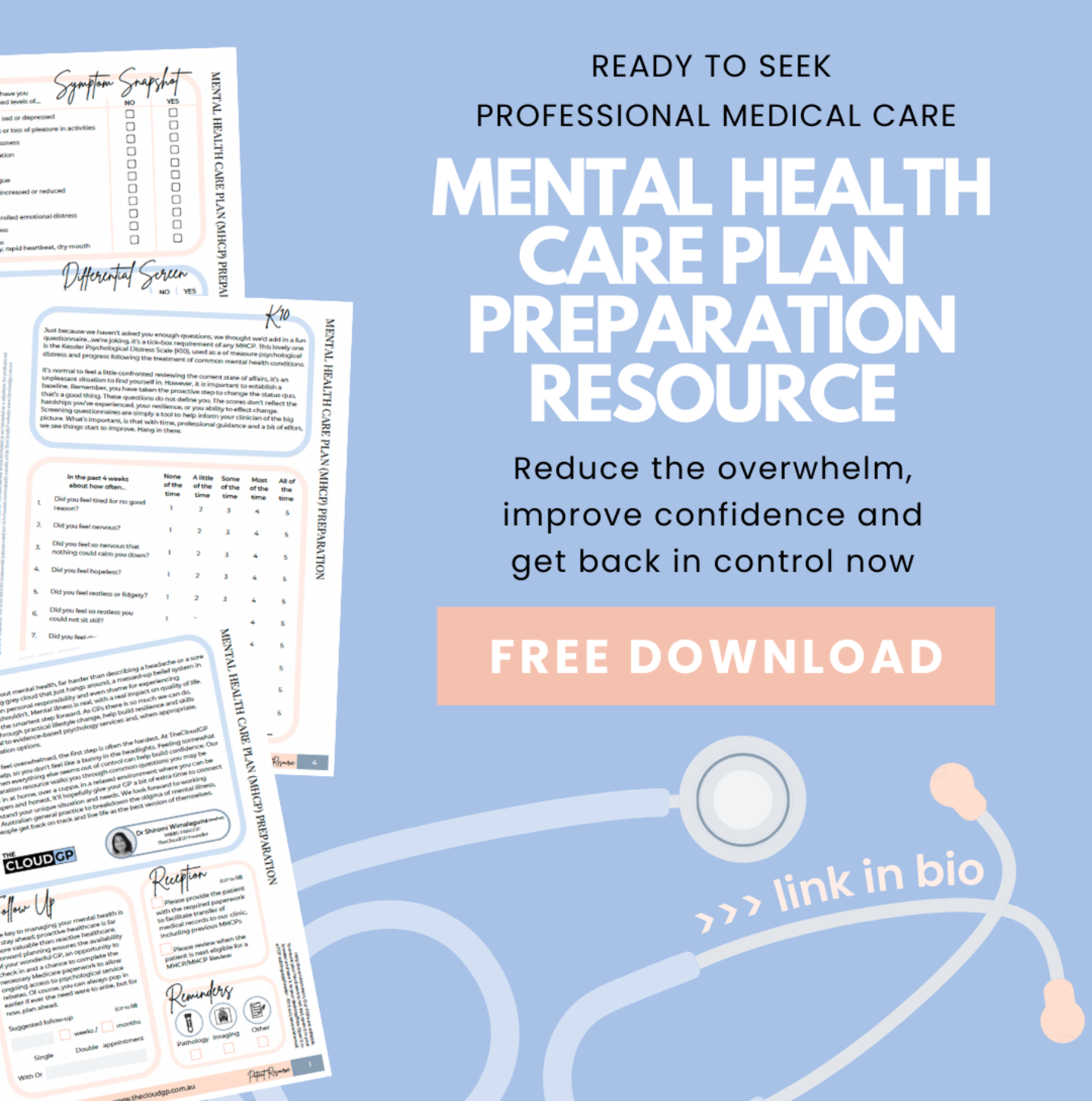 Feeling overwhelmed? Ditch the fear and uncertainty. Get a heads up on what your GP is likely to ask. Formulate a plan and walk into that appointment prepared and ready.